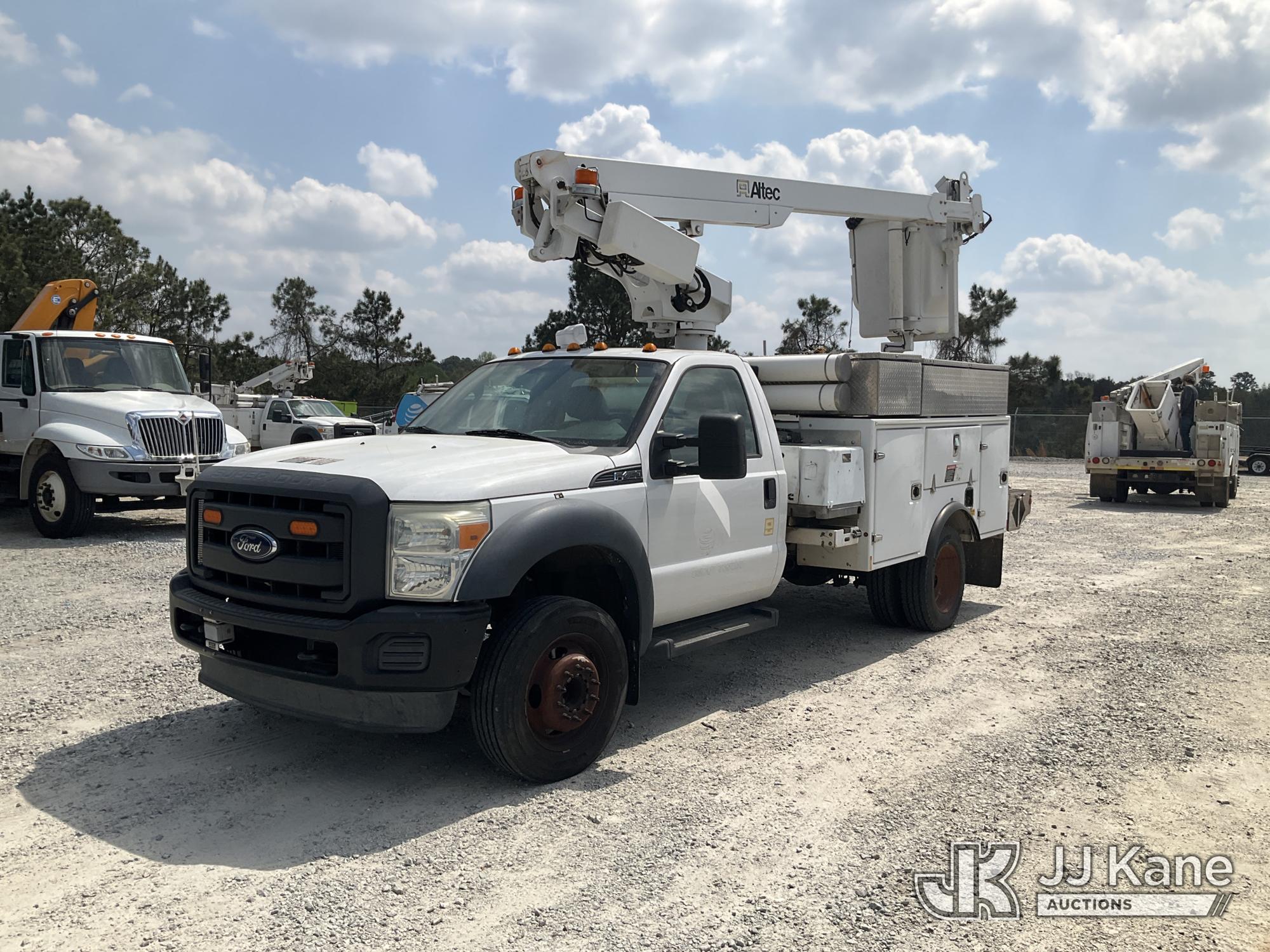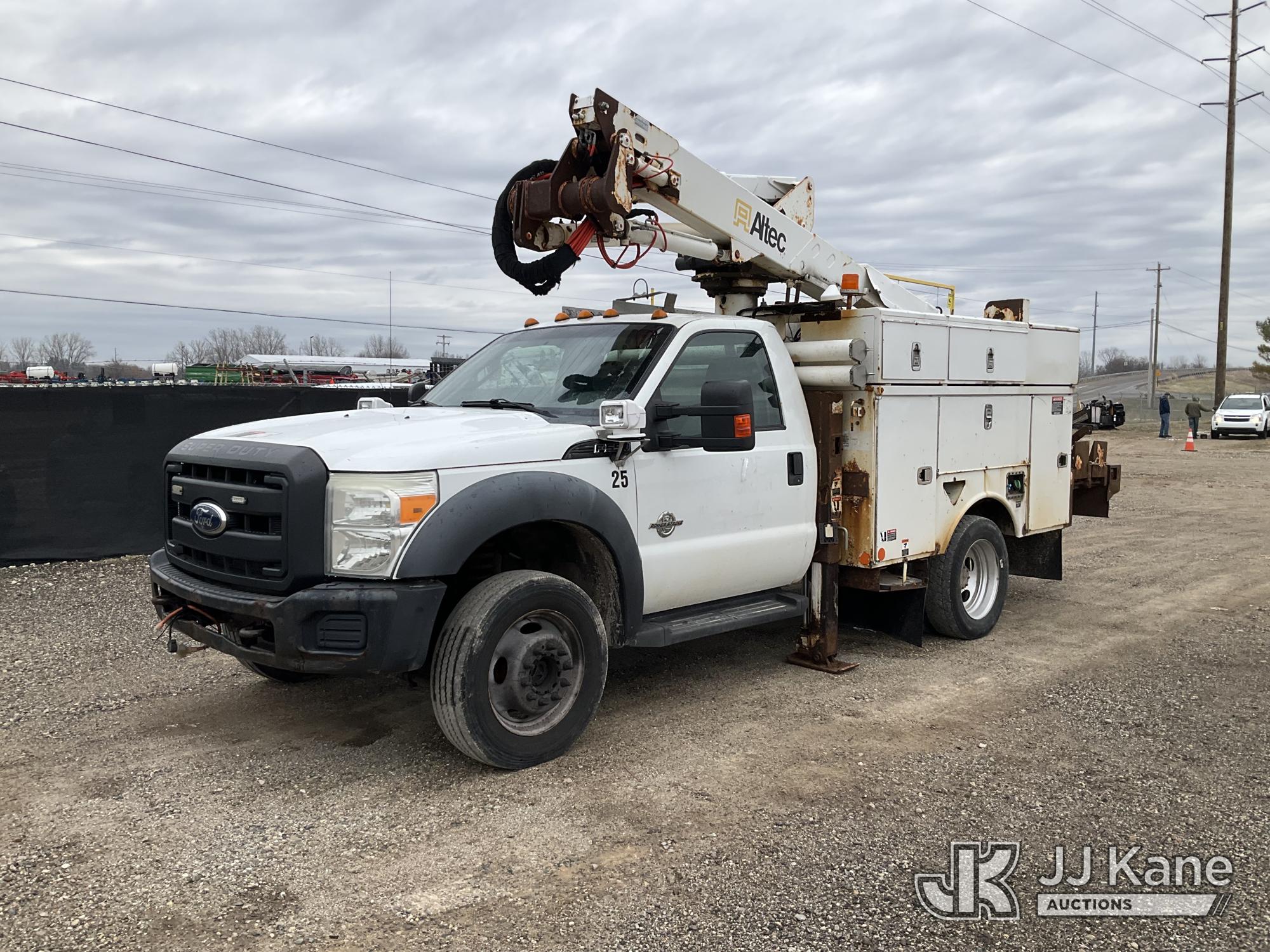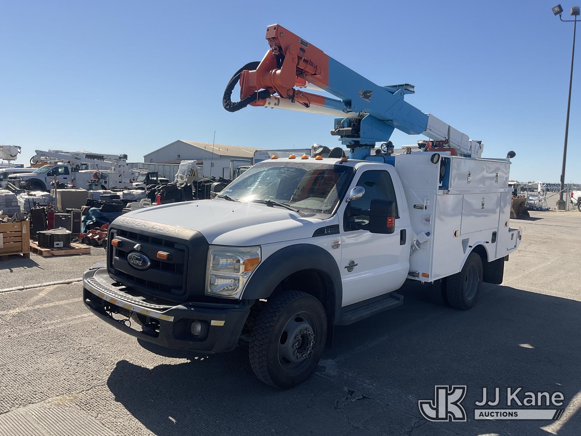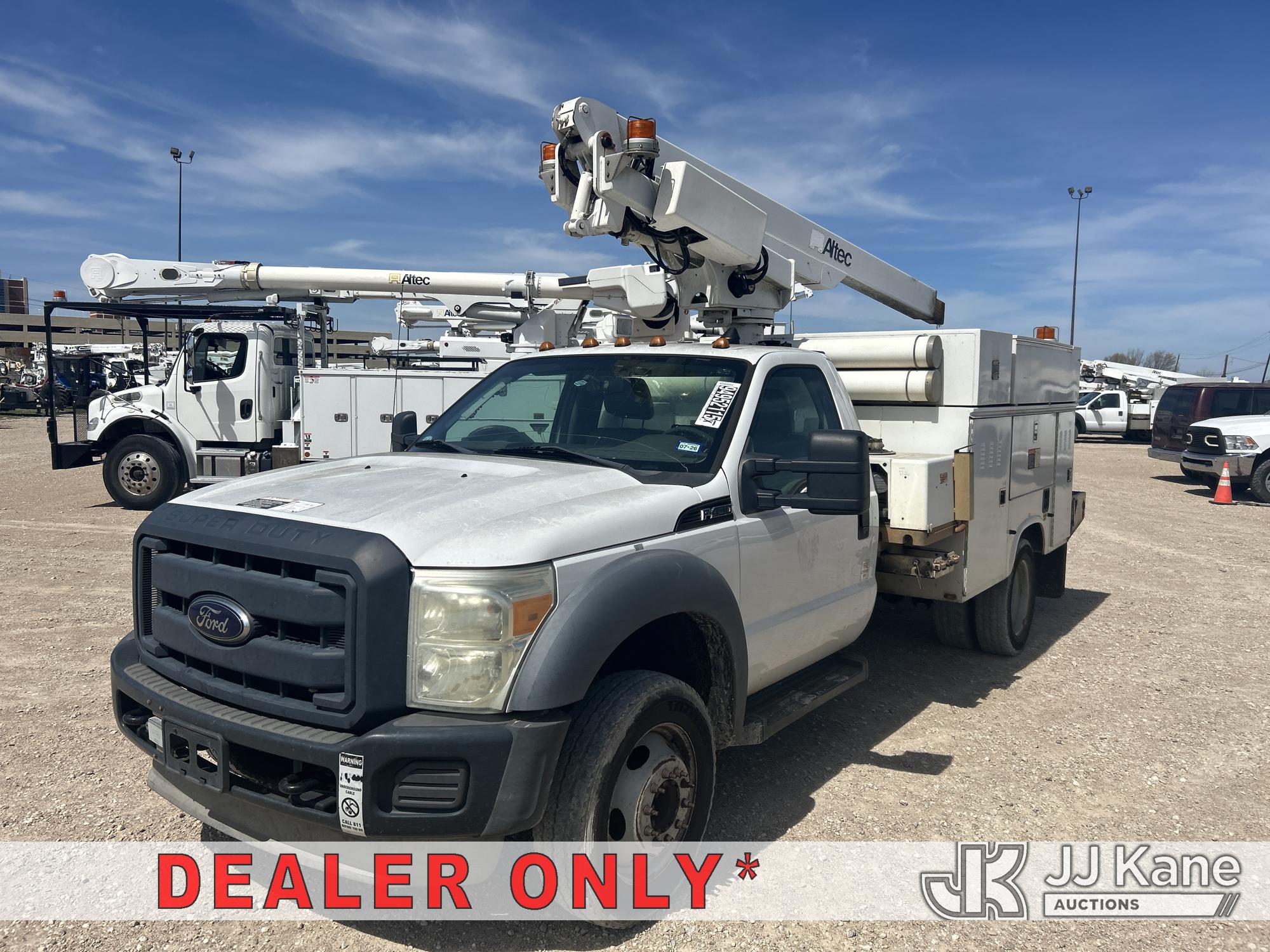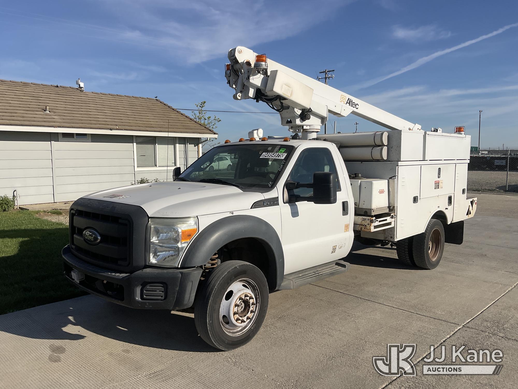 Altec AN55E-OC, 60 ft, Over-Center Material Handling Bucket Truck s/n 1012FK0161, with single-man bucket & 4 hyd outriggers, rear mounted on 2013 International 4400 Flatbed/Utility Truck, 9.3L L6 Dies...