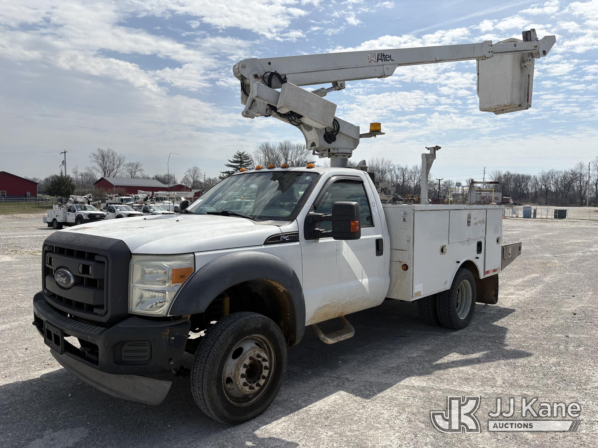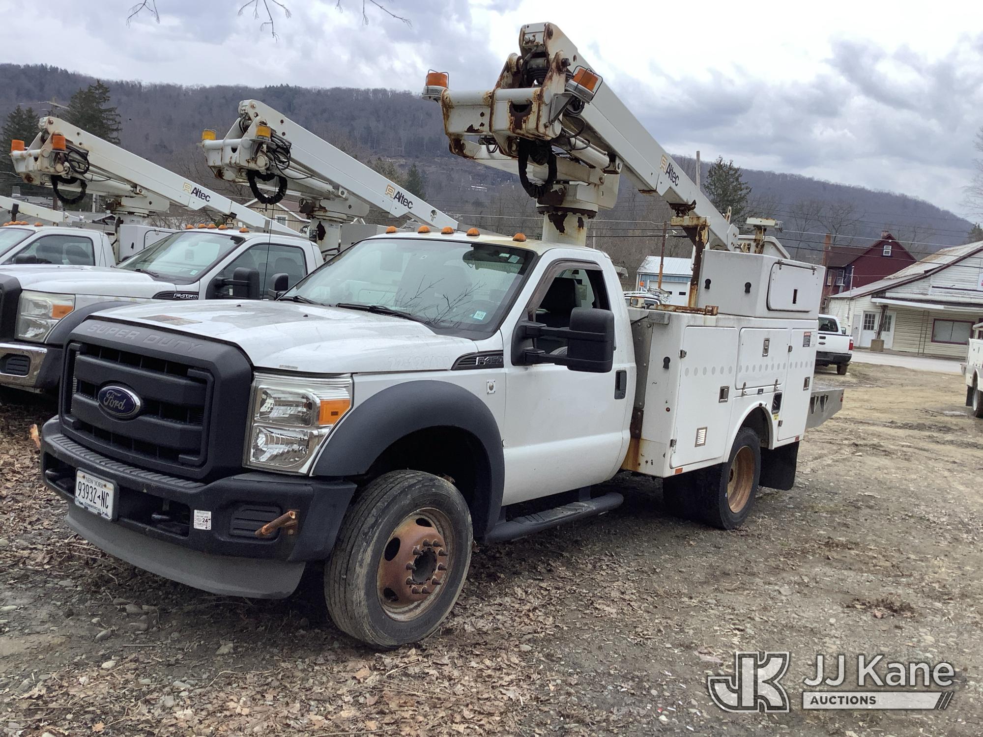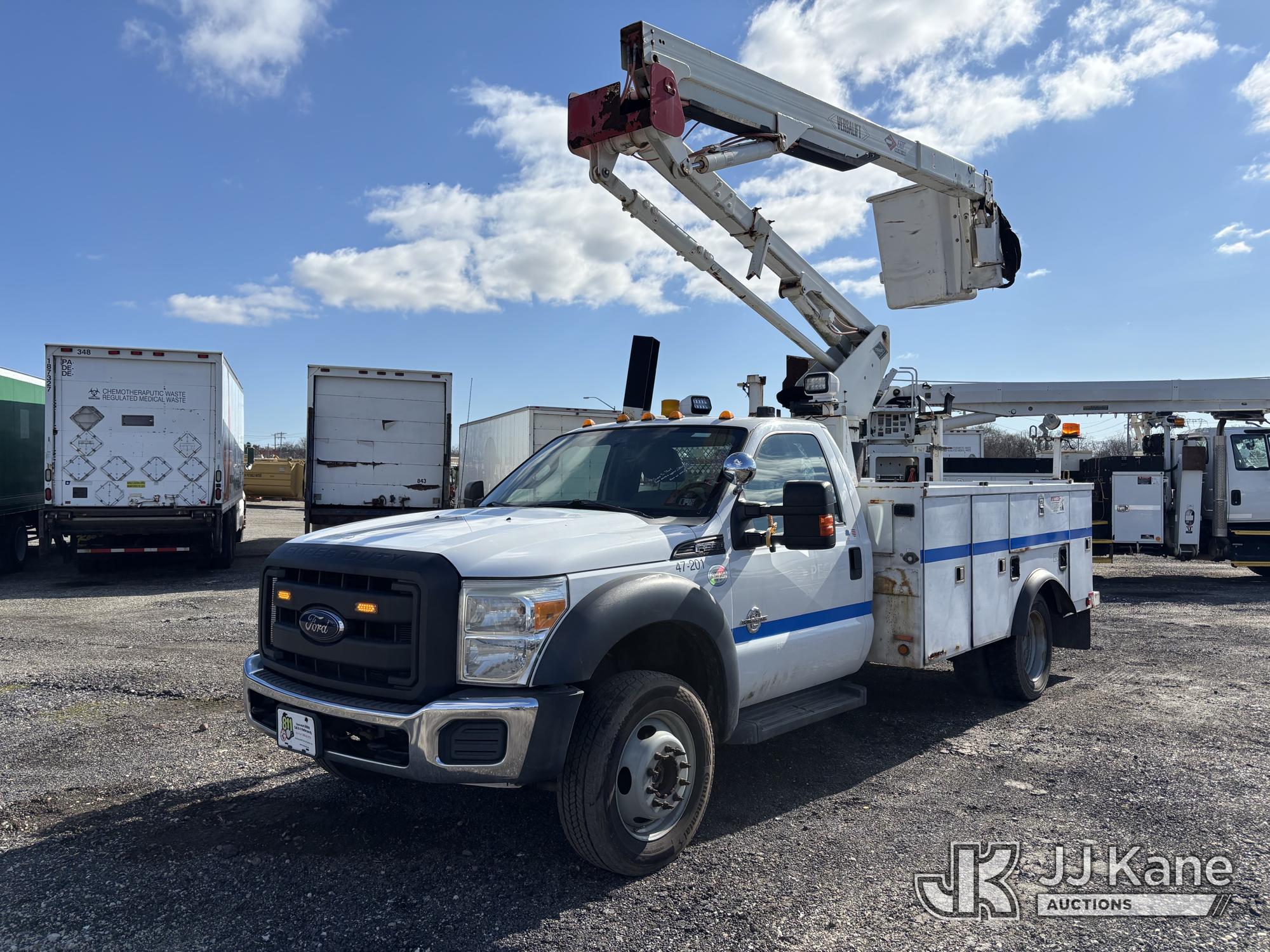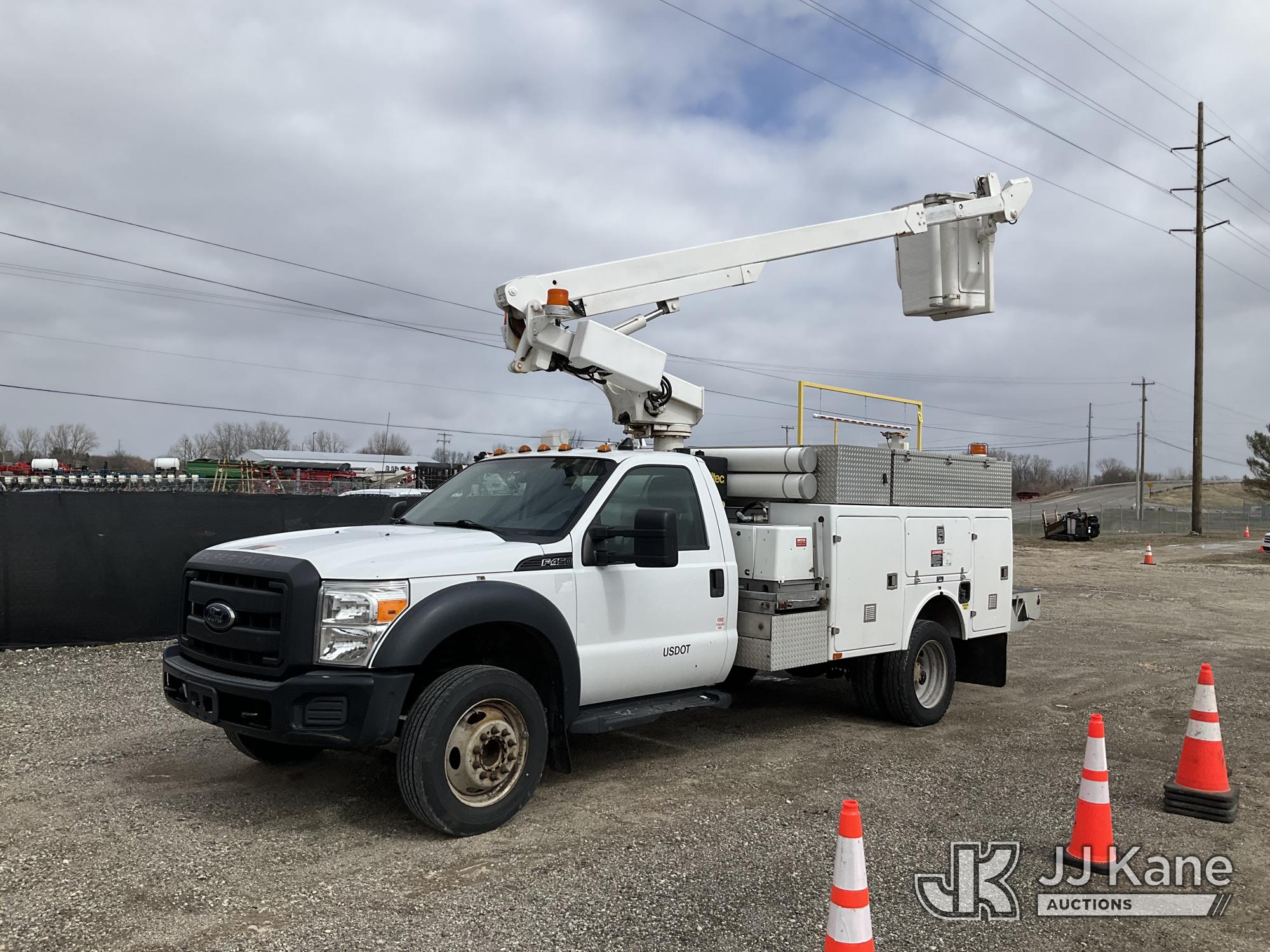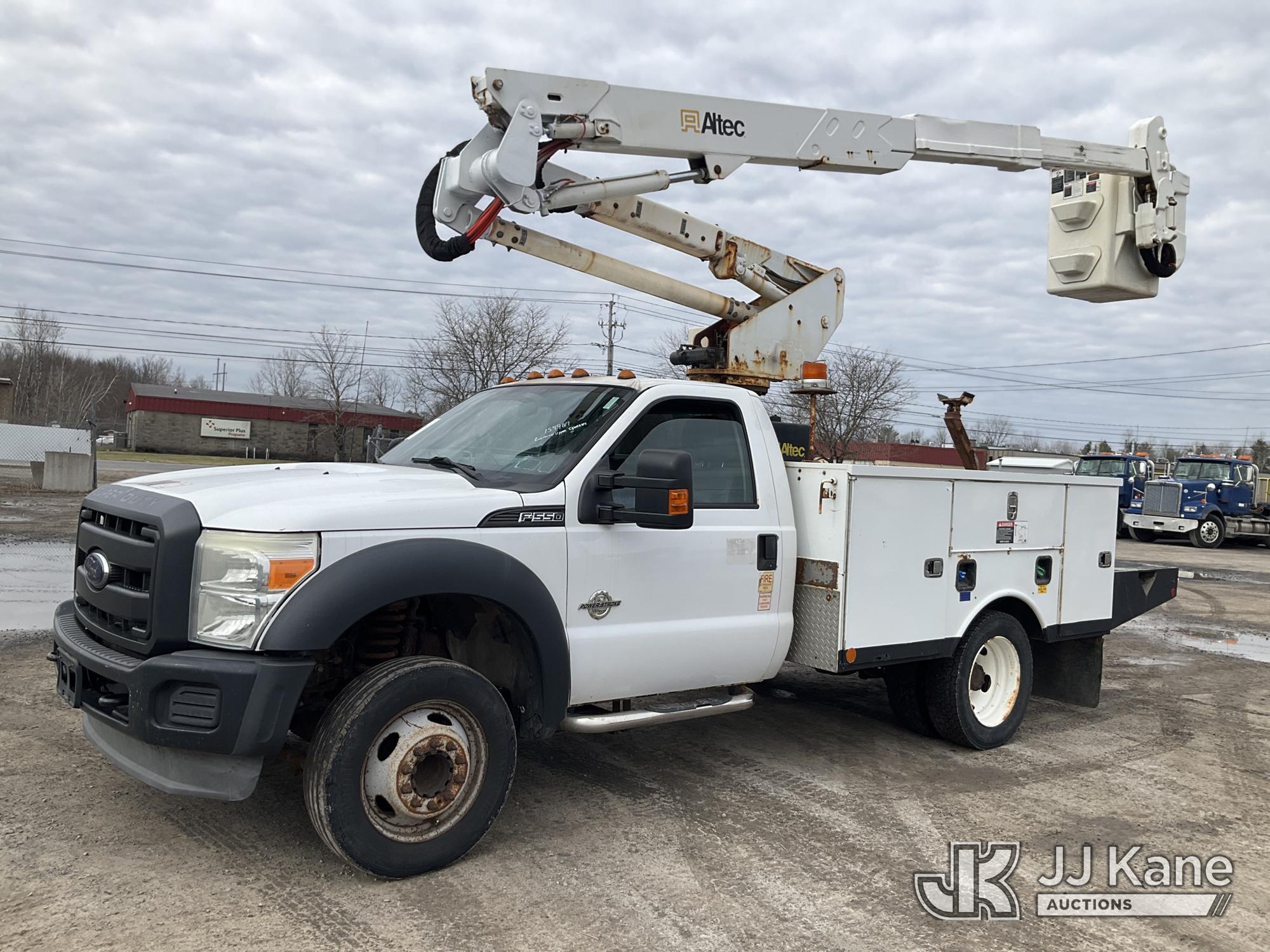 Altec AN55E-OC, 60 ft, Over-Center Material Handling Bucket Truck s/n 1012FK0161, with single-man bucket & 4 hyd outriggers, rear mounted on 2013 International 4400 Flatbed/Utility Truck, 9.3L L6 Dies...
